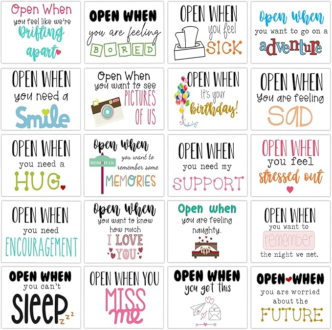 It’s not all jokes, mix in a little heart. Write funny “Open When” letters like “Open When You’re Hungry,” “Open When You Need a Laugh,” or “Open When You Miss Me.” It’s sweet, personal, and Pinterest-approved for couples who love thoughtful gestures.
