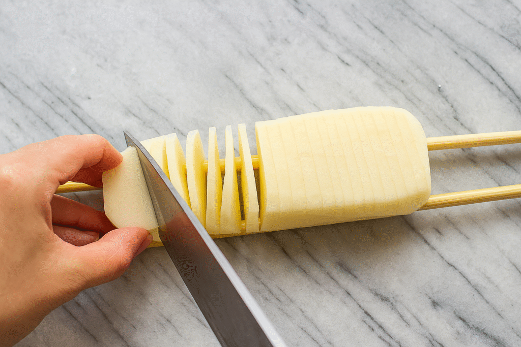 • Hold the potato steady and slice diagonally at a slight angle while rotating it slowly. This will create a spiral effect.