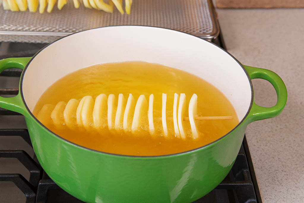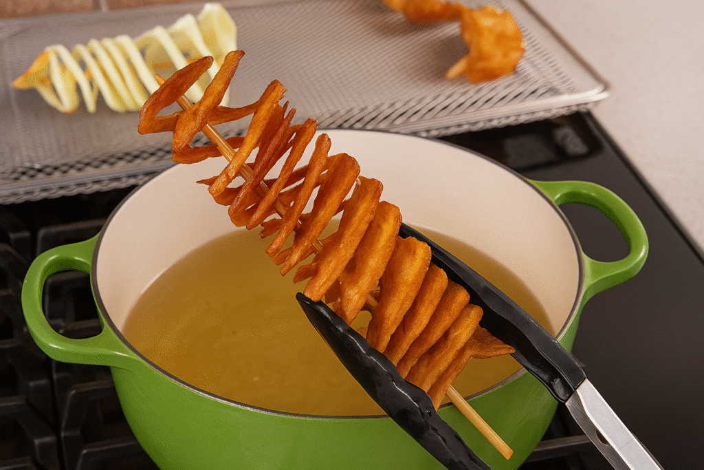 • Ensure the oil is deep enough to submerge the full potato spiral.