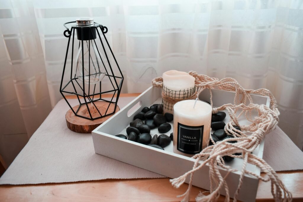 - Soy candles with vanilla or sandalwood scents = instant coziness.